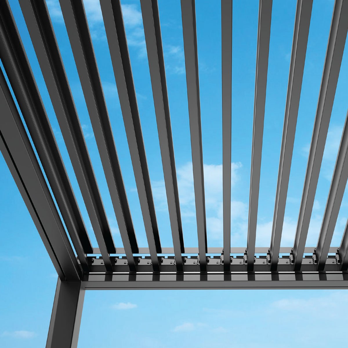 A tetőszerkezeten elhelyezett motoros, forgatható alumínium lamellák helyzetét könnyedén úgy változtathatjuk, hogy azok visszaverjék az égető napsugarakat, szűrt napfényt engedjenek át, teljes védelmet nyújtsanak az eső és havazás ellen, vagy akár zavartalan szellőzést biztosítsanak a pergola alatti levegő felmelegedése ellen.